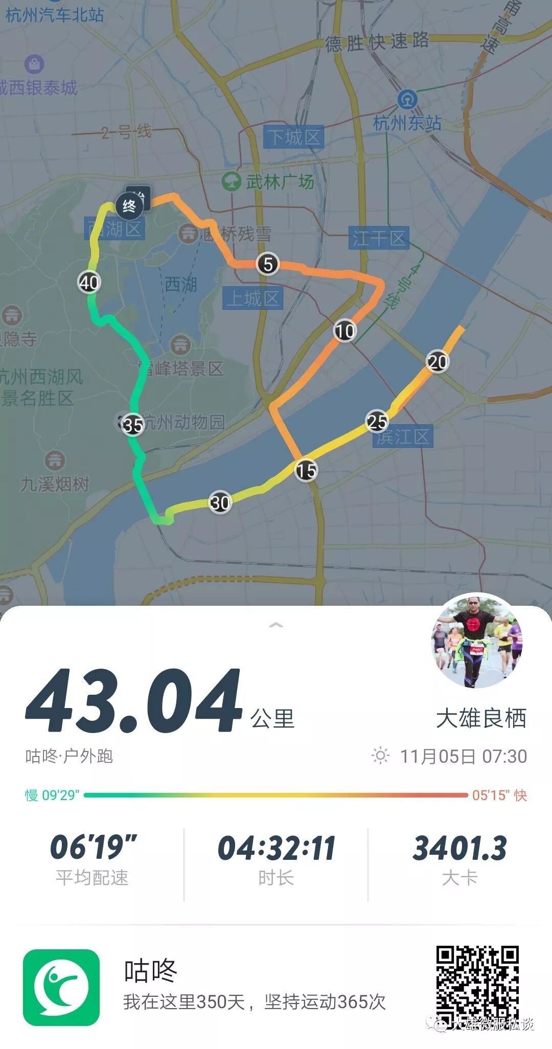 7点半准时开跑,跑到比较拥挤,跑不开,同时抡起脚跑感觉很吃力,但坚持住,第1到第5公里跑了27分钟,比之前赛事慢3-5分钟,起点偶遇的几位朋友已不见人影了;在第5公里补水,第6-7公里跑的更加吃力,跑到10公里补水,10公里成绩55分钟,有冷风瞬间降温,看看身边一个个超过的跑者,内心的淡定依然非常关键,意志很重要,但身体的信号很关键,我知道跑全马前半程肯定不能走,必须坚持跑下去,不然完赛的压力就大了,安全完赛是必然,但跑马的底线必须要完赛;10-15公里,完成时间1个小23分钟,期间还上了一趟厕所;跑完20公里1个小时52分钟,一直坚持跑完半程,22公里开始有意停下来走了一段路缓和缓和,感冒没有完全好转,跑起来步还真的觉得有些吃力,哪怕今天气温很适合跑步也是如此,跑完25公里耗时2个小时23分钟,这个进度不算太落后,但身体的疲倦感已开始了,比以往赛事撞墙时间提早,在25公里到30公里开始走走跑跑,缓过劲就跑,感觉很吃力就慢跑甚至就走路,认真听取身体的声音,抱有对马拉松的敬畏之心,这段5公里距离耗时35分钟;30公里到35公里,经过钱塘江大桥,虎跑路,觉得疲倦感有加强,之前上坡走路,这个阶段下坡和平路也走走跑跑,耗时42分钟,有史以来跑马最长耗时;35公里到40公里,虎跑路、杨公提、龙井路、灵隐路,最后5公里虽然很累,上坡也很虐,但杭马美景赛道我觉得这段是最美的(所有国内赛事当中最后的赛道都无法比拟杭州这段美景,简直人间仙境),跑的让人心旷神怡,在仙境之中如得神助,耗时仅30分钟,比前2段路程大幅提高速度,而人的疲倦感瞬间没有了,也许25-35公里的全马15公里瓶颈突破了;最后2公里没有冲刺,而是稳步向终点跑去,锁定完赛(净成绩)04:31:31,排名5000名以内。也是完成2017年的第八个全程马拉松(含3月份杭州问道越野50公里),自2015年3月开始累计至今的21个全程马拉松(含2个越野50公里,一是衡山越野50公里,而是杭州问道越野50公里)。