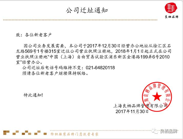 因公司业务发展需要,本公司于2017年12月30日经营办公地址从徐汇区石龙路569号1号楼315室迁往公司营业执照注册地,2018年1月1日起正式在公司营业执照注册地“中国(上海)自由贸易试验区浦东新区金港路199弄6号2010室”经营办公。
