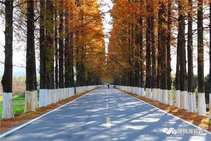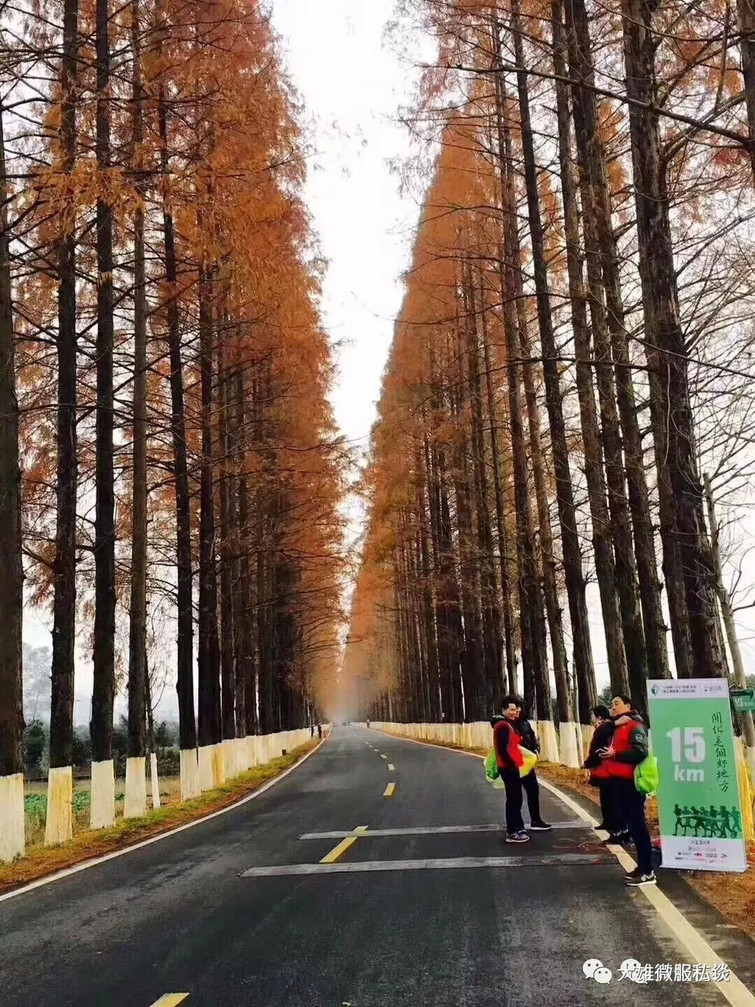 跑至6公里处,来到“浙江十条最美公路”之称的桃下线,公路全长22公里,这条道路春夏枝繁叶茂、绿荫如云,秋冬色彩金黄、诗意十足。由桃溪村至下界首公路段,道路两旁笔直挺拔的水杉高耸入天,犹如两道金黄的屏障将道路与田野隔开,打造出新一代的“开化黄”。桃下线独有的水杉大道,向来是摄影师拍照圣地;