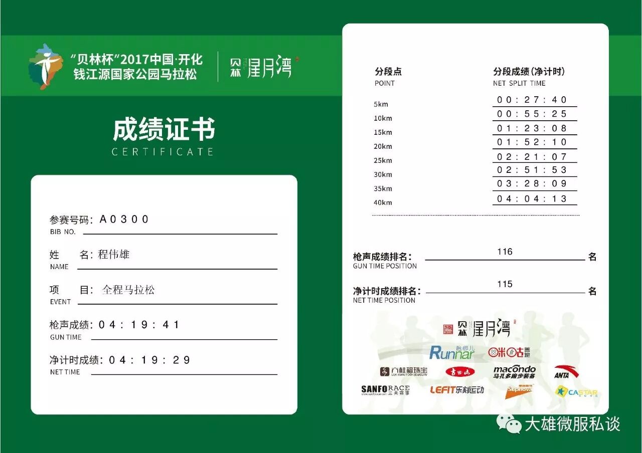 坚持就是胜利!2017年收官之战终于落下帷幕,以净成绩04:19:29取得全程所有选手排名第115名,继2月港马之后的第二好成绩,在今年一个很好的开端又有一个很好的收官,期待2018年马拉松赛季继续的坚持!
