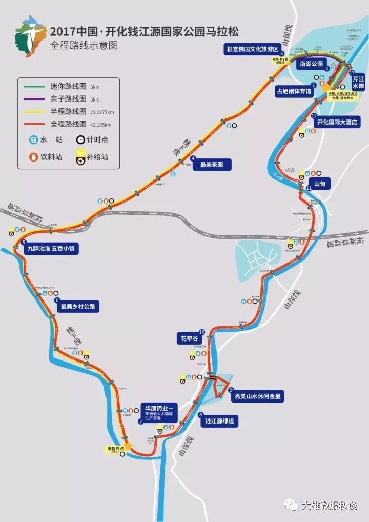浙江开化钱江源国家公园马拉松起点、终点在占旭刚体育馆,最美马拉松赛道线全程42.195km沿着桃下线、城华线,途经根宫佛国、九醉池淮、花牵谷等开化风景区。首届家乡全程马拉松必须前来参加,也是2017年第10个全程马拉松,自2015年3月开始的马拉松历程累计第23个全程马,2017年马拉松收官之战就放在浙江开化。专程提早一天从上海驱车近500公里回开化参赛。