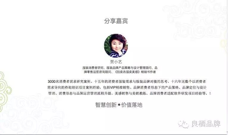 由于我做了大量的调研定制型内训我对很多品牌的产品风格。搭配风格还有消费群的受众的宽度深度有了很多的应对方法的累计。调研后定制的搭配内训的可以很轻易的发现,关于品牌产品设计。客群定位等多方面的不足和解决方法。比如我总结得便于导购精准推荐精准回访的顾客会员档案格式。通过会员管理培训后救活了很多即将倒闭的店铺。比如便于引流及转化提升的产品组合方法。和设计师筛款流程,让一些品牌的订货能够良性增长。