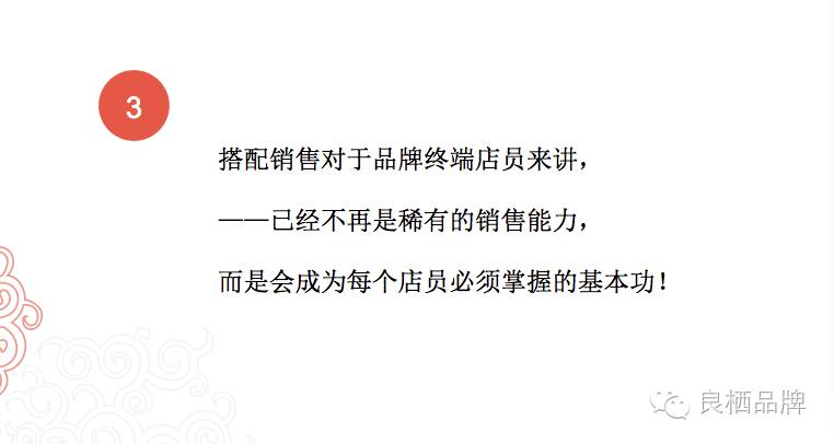 随着各种媒体以及广大的品牌搭配销售的推广传播。目标消费者呢如今是越来越理性越来越成熟了。搭配销售已经慢慢变成了每一个导购的基本功,而不是稀有的销售能力。搭配销售在终端给顾客的体验形式也正在变得多种多样。现在这流行这个智能搭配试衣呃包括对于我们的这个品牌的商品企划来讲。从那个品牌的深层次角度来完成这个产品的搭配企划。都是根据解决消费者搭配参与体验的方法。未来搭配还会成为顾客自主选择的乐趣,而不是导购的搭配推荐销售的压迫感。所以未来的品牌门店的店员为顾客提供专业搭配。呃推荐销售服务的水平要求会更高,这是消费者需求趋势所决定的。