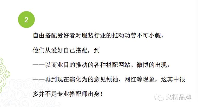 从技术角度而言呢这样搭配引导其实只要善于不断学习和流行趋势。呃具备一些基础的搭配技能就可以做得很好,这是我们服装行业其实很容易做到的。每个企业里可能都会有这样的几个人,嗯如果规划一下这些搭配爱好者的工作分工的话。你的服装品牌也可以打造一些意见领袖来推广品牌。为这个品牌吸引粉丝发现引导性的需求为品牌消费者这个销售生态打下一些基础。