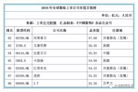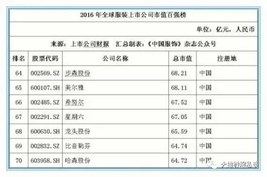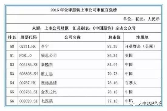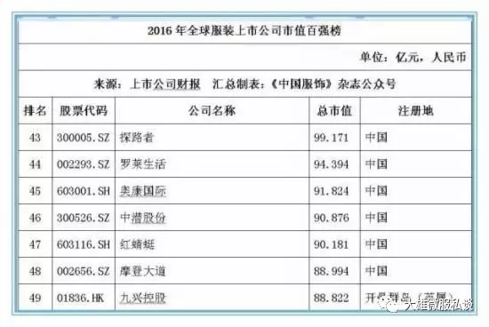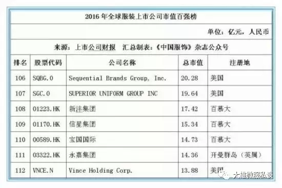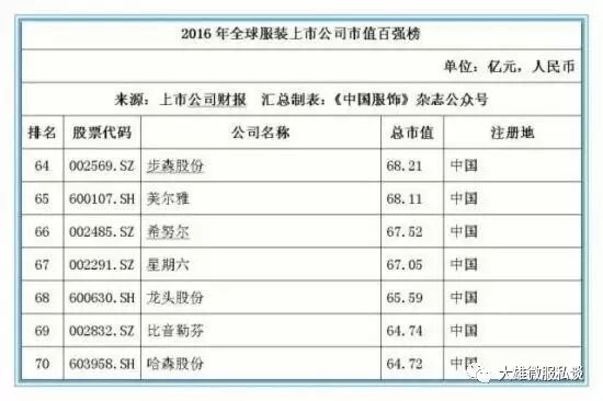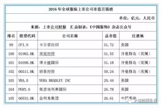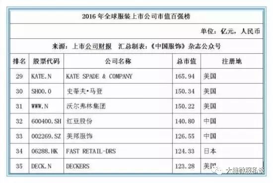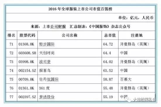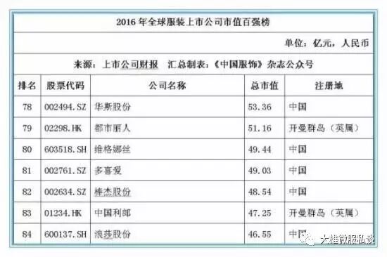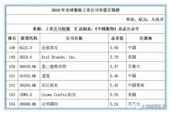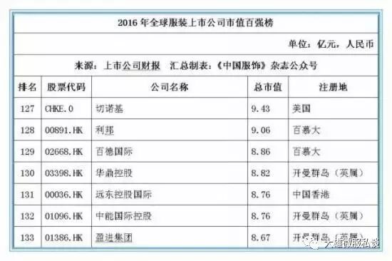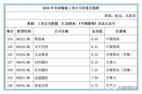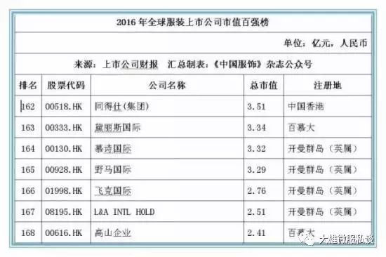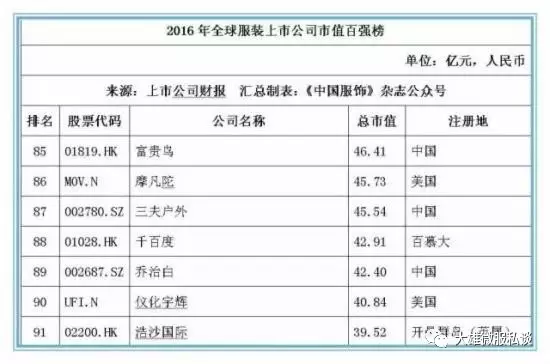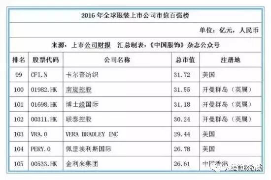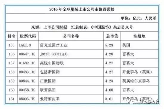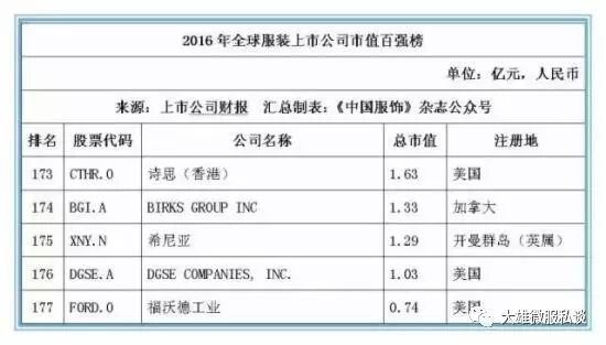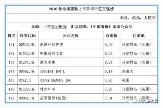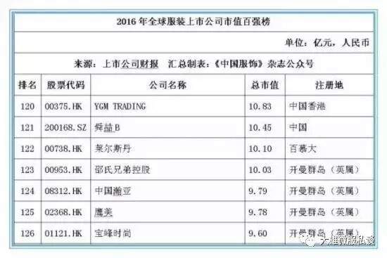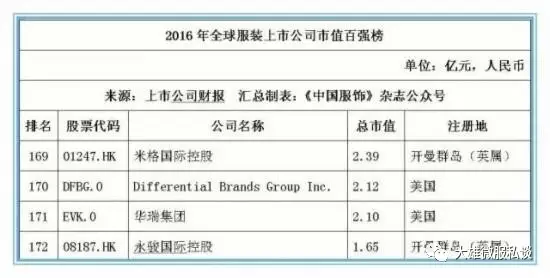 记者获得的数据显示,截止2016年12月31日,全球177家纺织服装上市公司总市值金额达25046.39亿元人民币,按照市值排名前5位的上市公司经营情况分别如下: