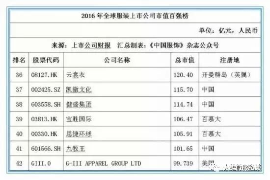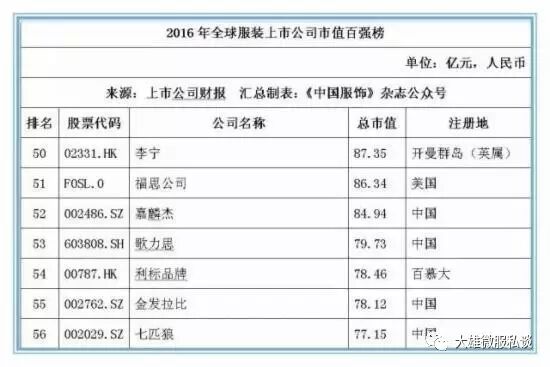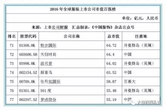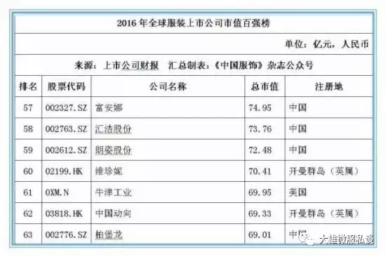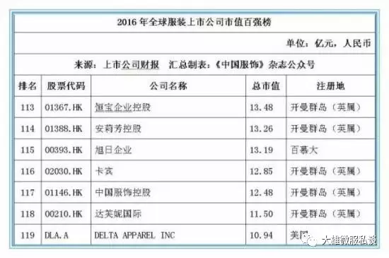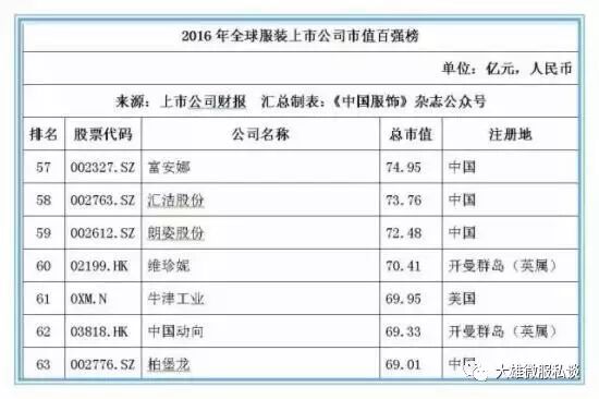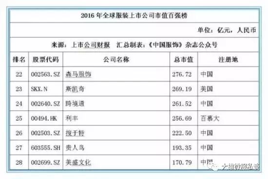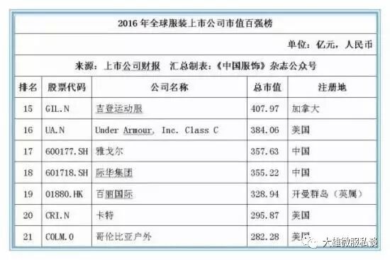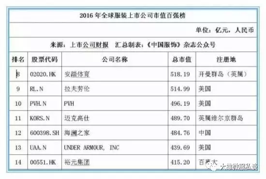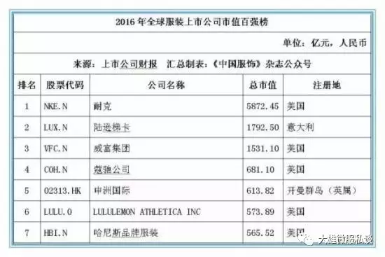 截止2016年12月31日,在全球177家纺织服装上市公司按市值排名前20位的公司中,有7家中国公司位列其中,这七家中国公司分别是:申洲国际、安踏体育、海澜之家、裕元集团、雅戈尔、际华集团和百丽国际,而排名前20位的大部分上市公司均以美国为主,运动品牌耐克以5872.45亿元人民币的市值位居桂冠。