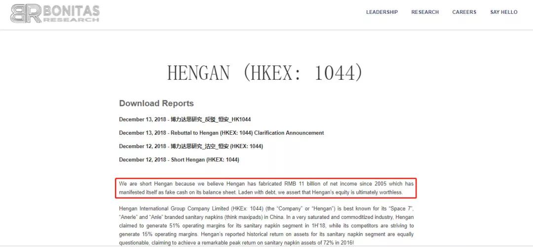 而Bonitas的成名之战,应该是2018年12月12日做空了恒安国际。Bonitas称恒安国际财报中现金项目作假,自2005年以来总共有110亿元的净利润皆系虚构,股票的合理价值应为零。