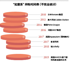 2016年,如意科技斥资13亿欧元成为法国轻奢集团SMCP的控股股东;2017年,又以1.17亿美元收购英国风衣品牌雅格狮丹、以22亿港元拿下高端男装品牌香港利邦控股;2018年,据外界估算,邱亚夫通过如意时尚约以7亿美元收购瑞士奢侈品牌Bally;2019年初,以26亿美元收购了美国英威达公司服饰和高级面料业务,包括莱卡LYCRA品牌。